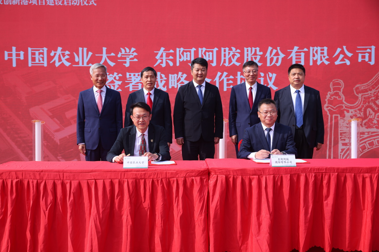 北京市政府黨組成員、副市長穆鵬,國家發(fā)展改革委社會發(fā)展司司長劉明,農(nóng)業(yè)農(nóng)村部科學(xué)技術(shù)司司長周云龍,教育部發(fā)展規(guī)劃司副司長、一級巡視員田福元,中國農(nóng)業(yè)大學(xué)黨委書記鐘登華,北京市平谷區(qū)委書記唐海龍、區(qū)長狄濤,東阿阿膠總裁程杰等領(lǐng)導(dǎo)嘉賓,來自國家部委、北京市、平谷區(qū)、中國農(nóng)業(yè)大學(xué)等相關(guān)單位負(fù)責(zé)同志,專家代表、師生代表、企業(yè)代表共同見證這一重要時刻。儀式由中國農(nóng)業(yè)大學(xué)校長孫其信主持。中國農(nóng)業(yè)大學(xué)副校長辛賢與東阿阿膠副總裁劉廣源分別代表雙方在戰(zhàn)略合作協(xié)議書上鄭重簽約。